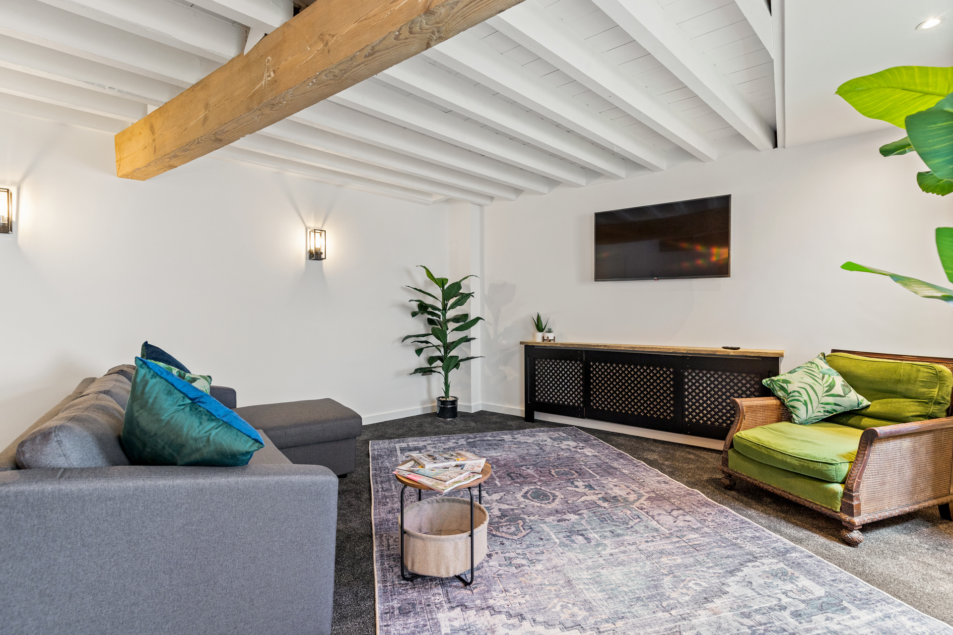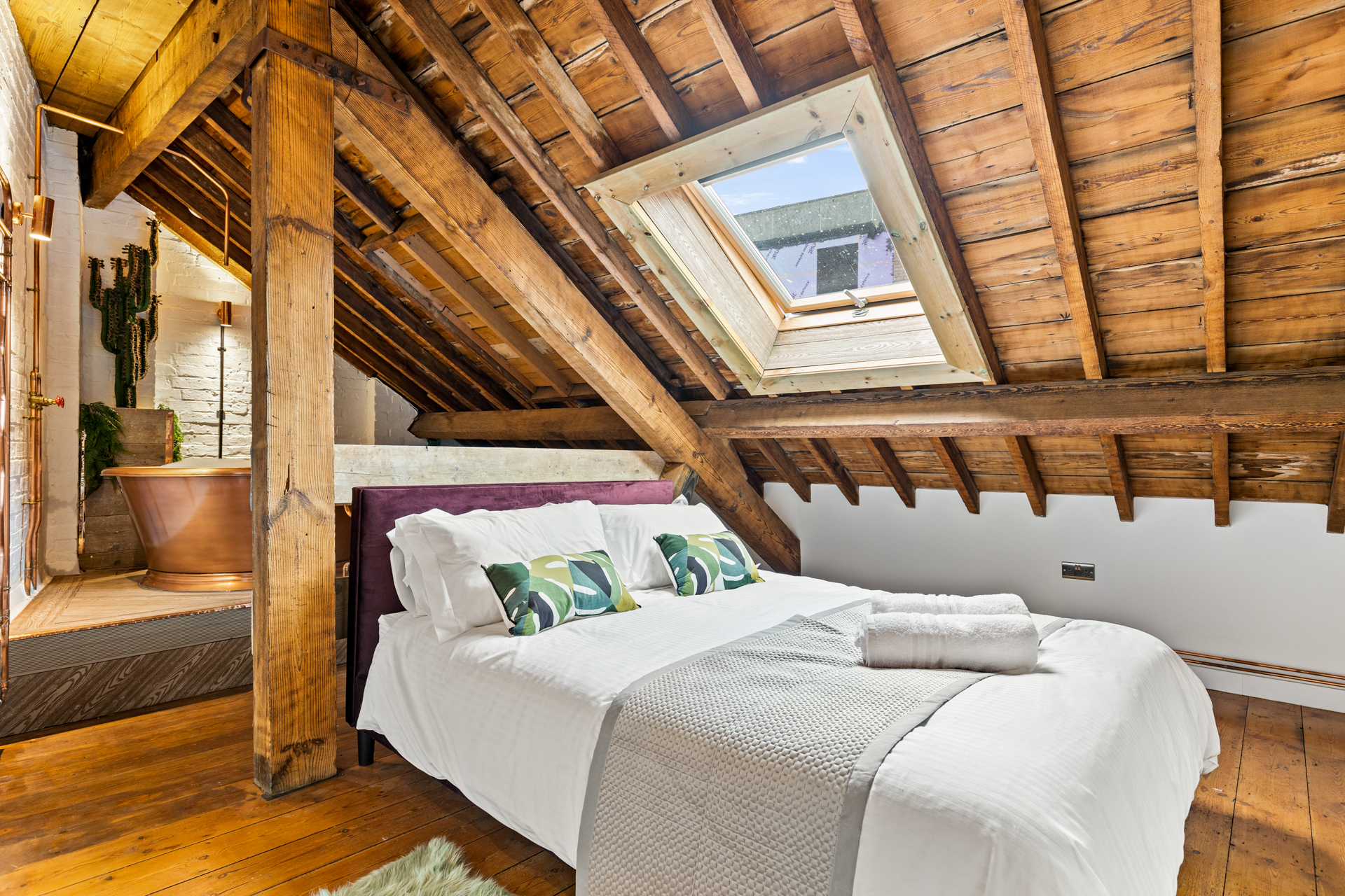 This apartment boasts an open-concept layout with a striking split-level design, adding a touch of architectural brilliance that sets it apart from conventional living spaces. The open-plan kitchen and living area, situated on the lower split level, features cozy furniture, creating an inviting ambiance perfect for relaxation and entertainment. The kitchen offers top-of-the-line appliances and ample counter space. The bathroom on the lower level is of modern design, featuring sleek fixtures, premium surfaces, and a rainfall shower. Ascending the staircase to the upper split level, you’ll find the spacious bedroom with a plush king-sized bed is nestled beneath the wooden beams adding character to the room. Indulge yourself in the centrepiece of this extraordinary apartment: the large, round copper bath. This luxurious focal point invites you to unwind and immerse yourself in a spa-like experience, Adorned with a cascading waterfall fixture. To top it all off, a private veranda awaits just off the living area, offering a outdoor escape. This exclusive space is perfect for morning coffees or evening cocktails. Experience the epitome of refined living in this luxury one-bedroom apartment, a true haven for the discerning individual seeking a residence that is as unique as it is indulgent.