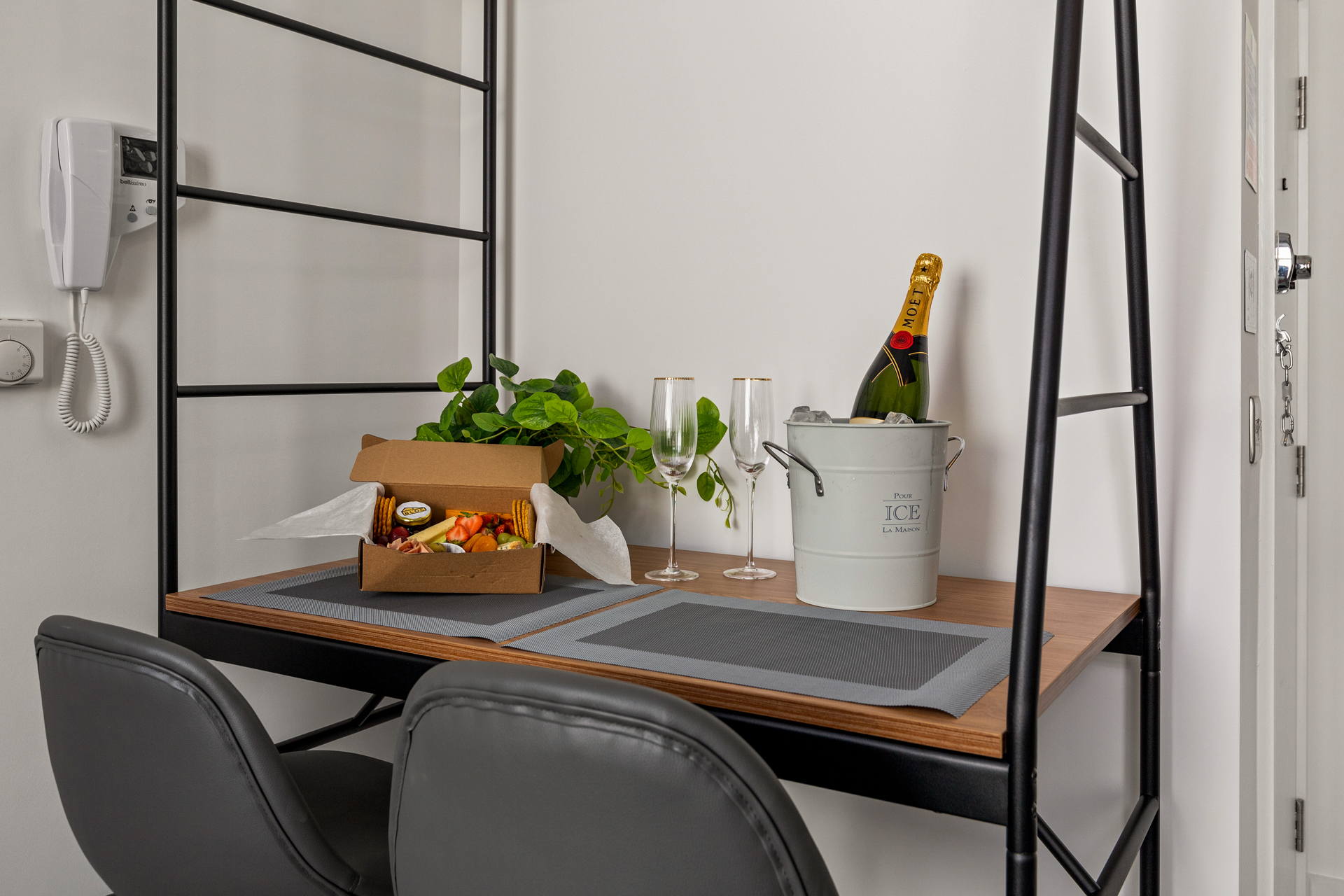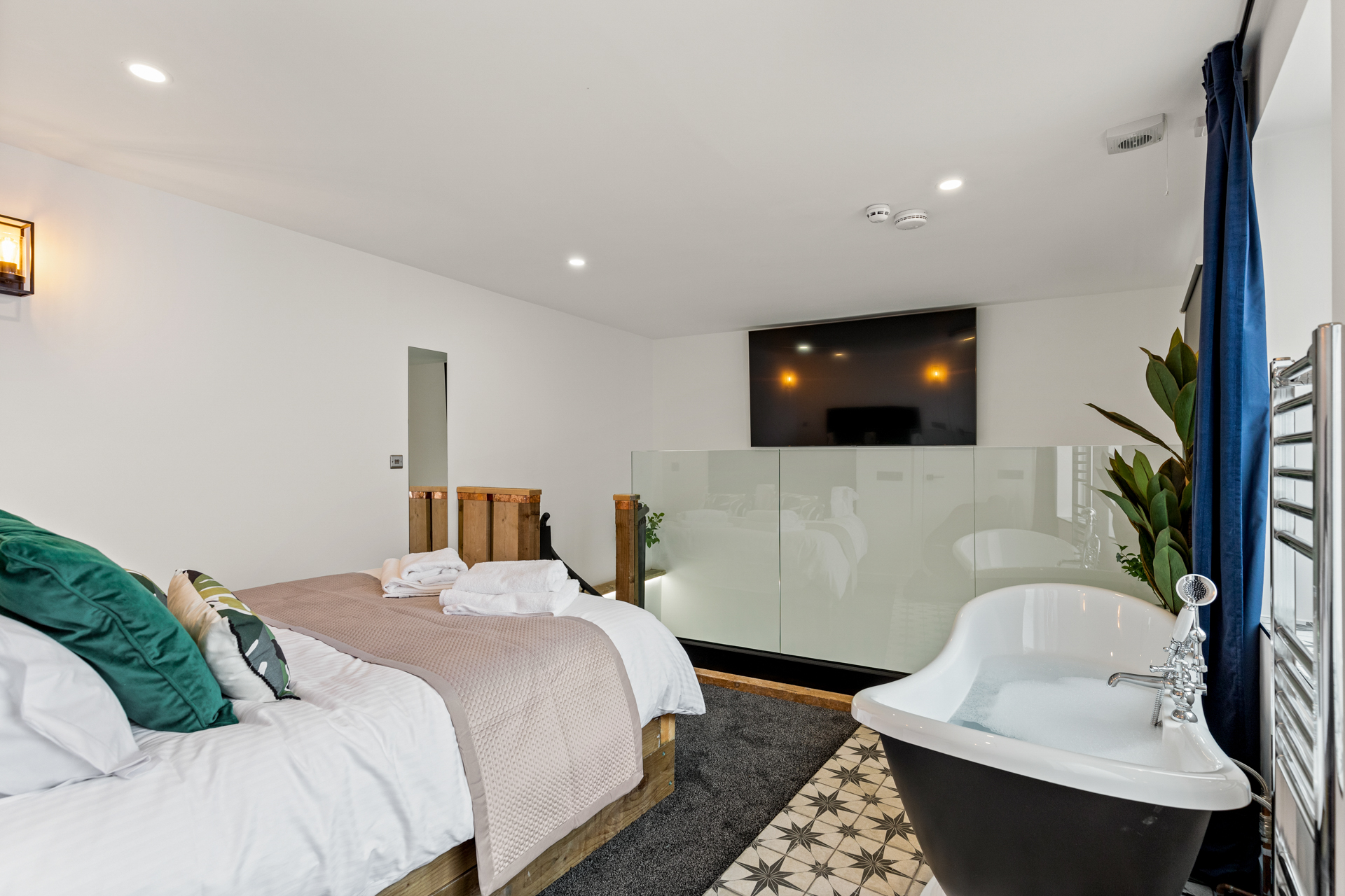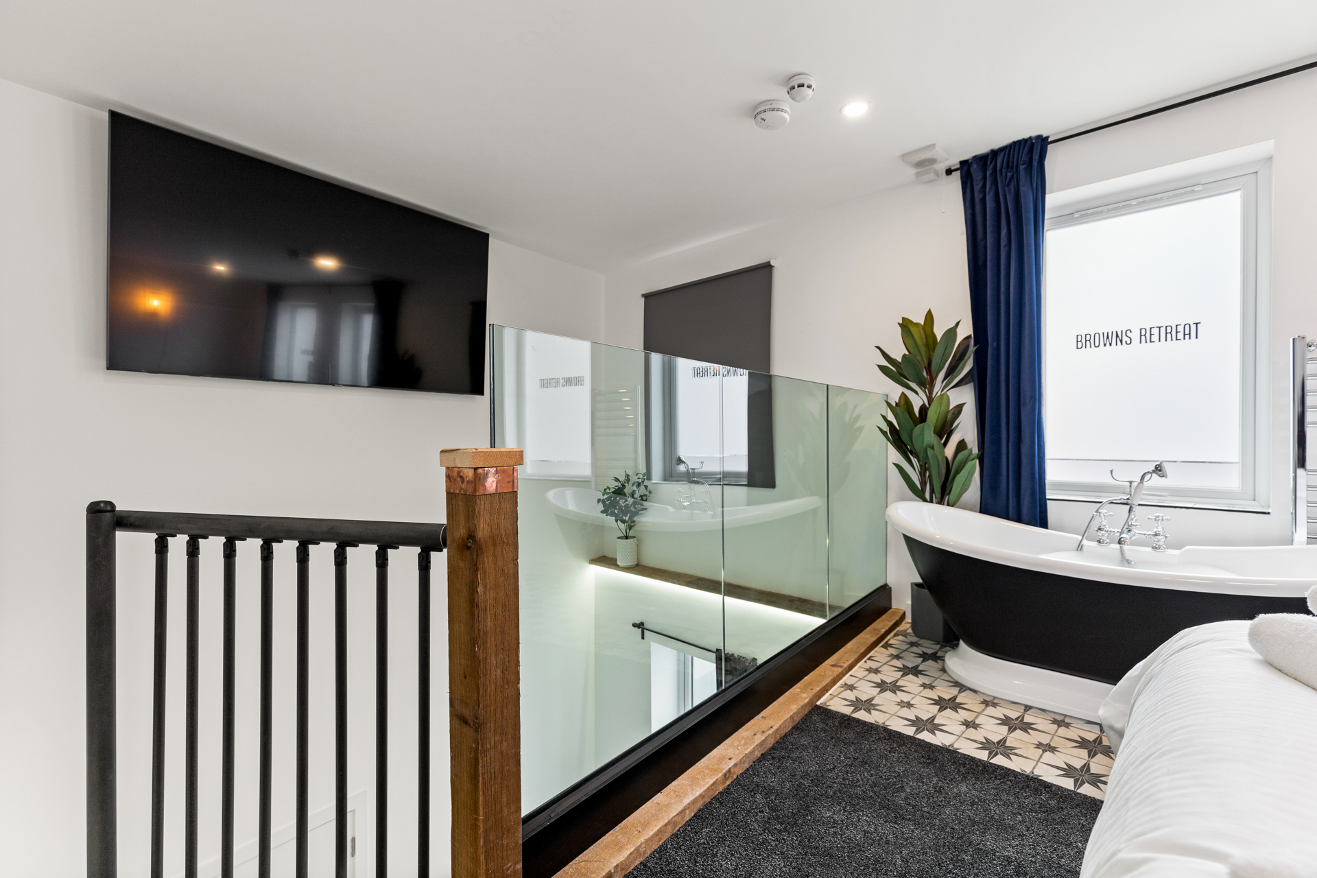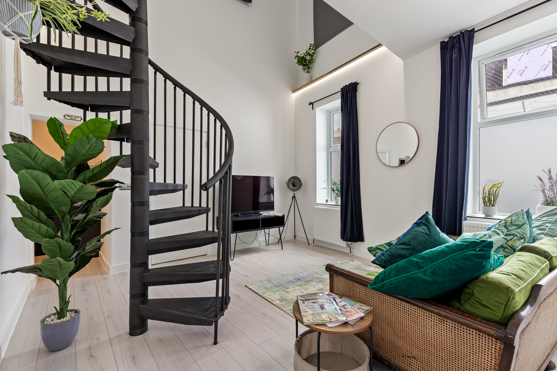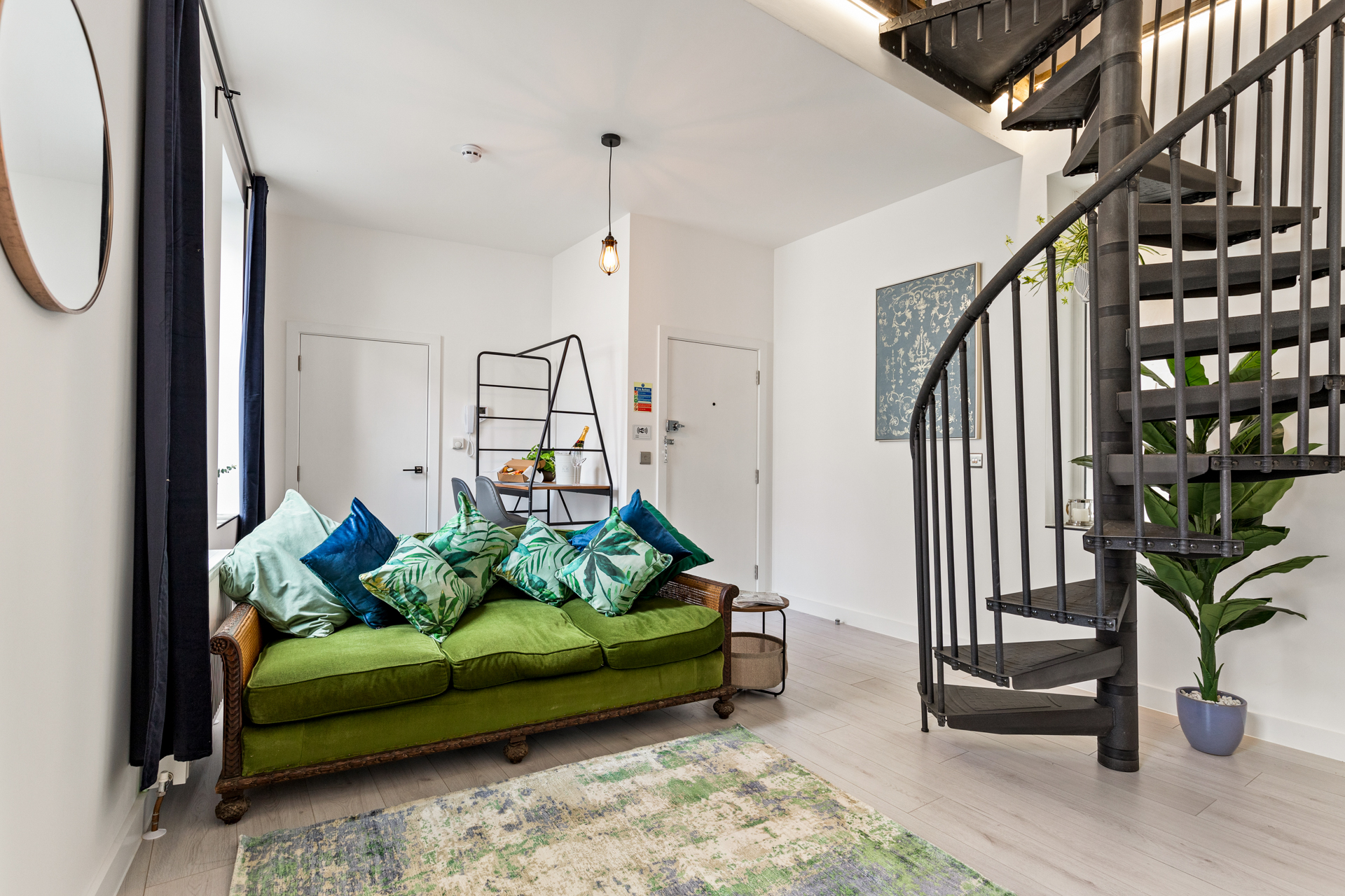 Upon entering, you’ll be greeted by a spacious living area that exudes modern elegance. The open- concept layout is enhanced by large windows and sleek furnishings to create an airy and inviting atmosphere, ideal for relaxation and entertainment. The standout feature of this apartment is the captivating spiral staircase that leads to the upper level. The spiral staircase adds a touch sophistication to the overall design, becoming a striking focal point of the space. As you ascend the spiral staircase, you’ll discover the bedroom retreat nestled on the split level. Here, comfort and style intertwine seamlessly. The bedroom is adorned with luxurious fabrics and finishes and a plush, king-sized bed. The bathtub in the bedroom adds a touch of opulence and allure, creating a spa-like experience right in the comfort of your own home. Back on the main level, the modern kitchen boasts high-end appliances and custom cabinetry equipped with your essential kitchenware. The bathroom is also located on the lower level and offers a modern design, featuring sleek fixtures, premium surfaces, and a rainfall shower. The split-level design of this apartment not only creates an intriguing visual appeal but also allows for a distinct separation of spaces, providing privacy and versatility. It’s perfect for those who desire an elegant and luxury holiday space.