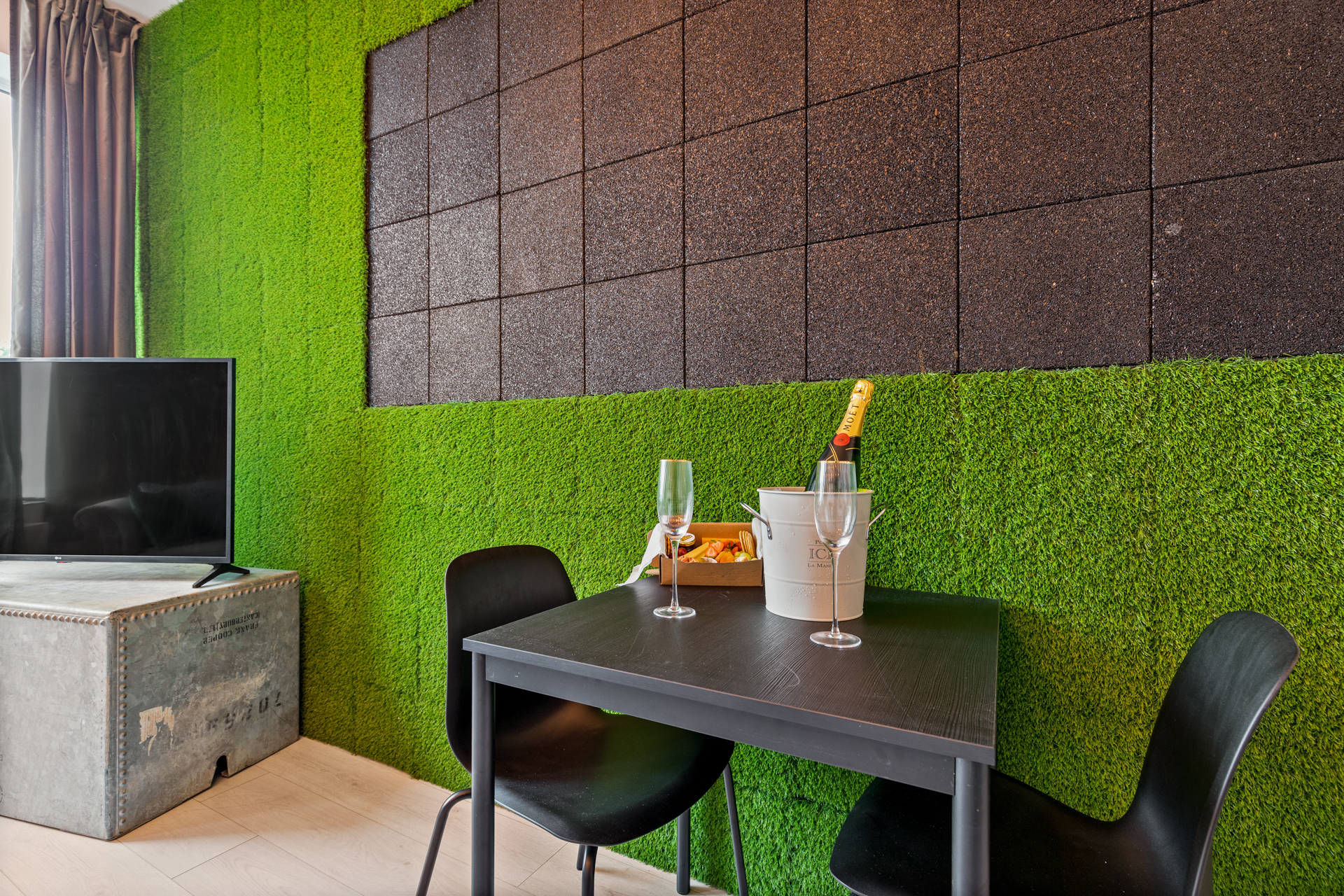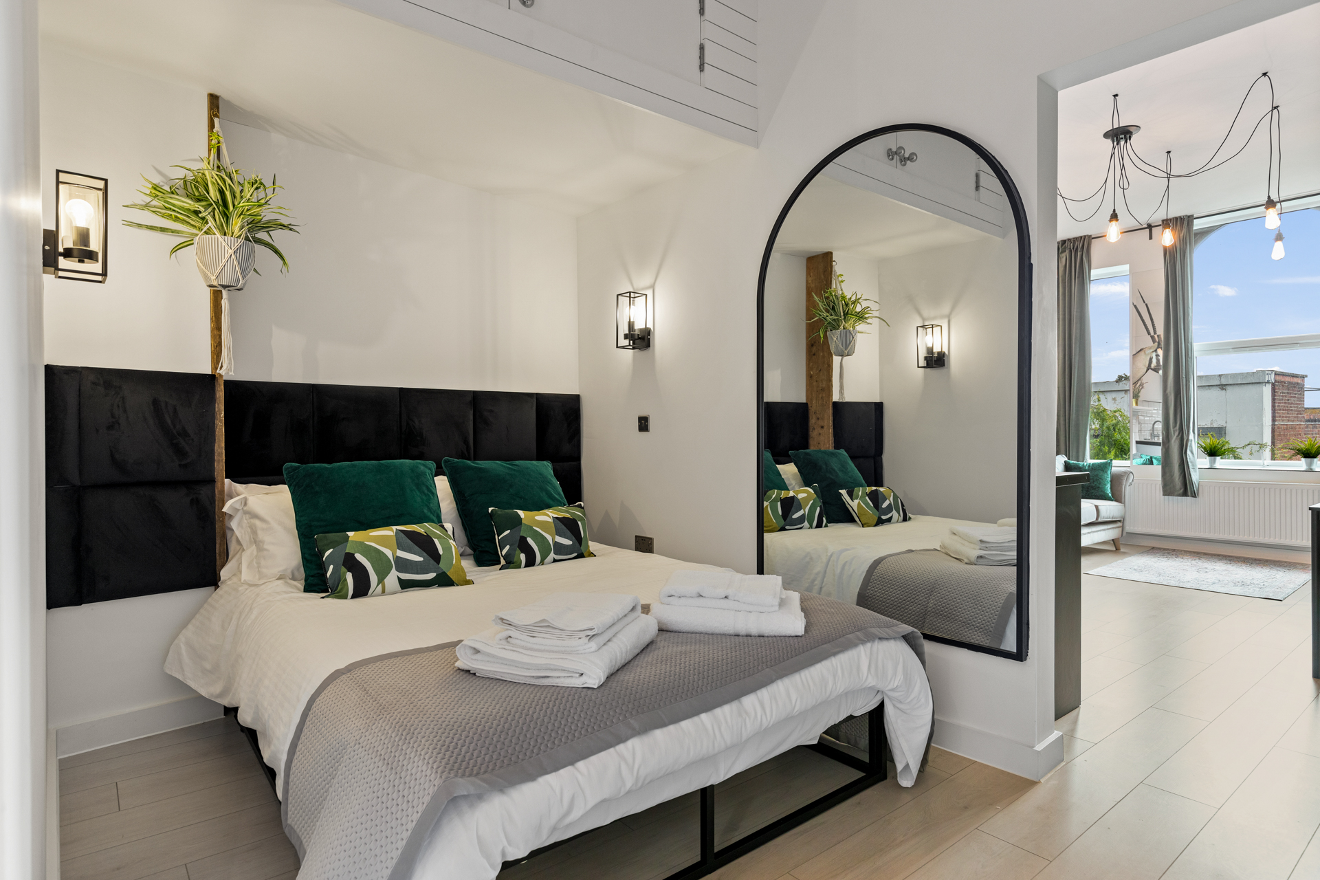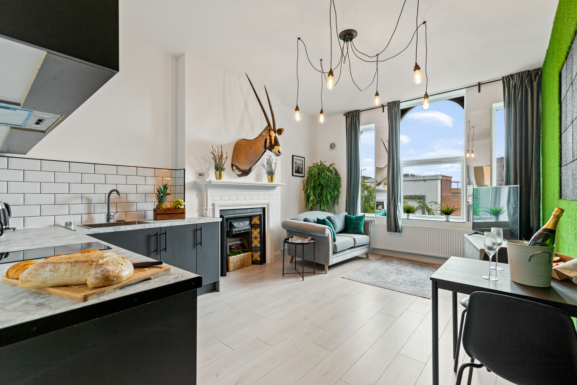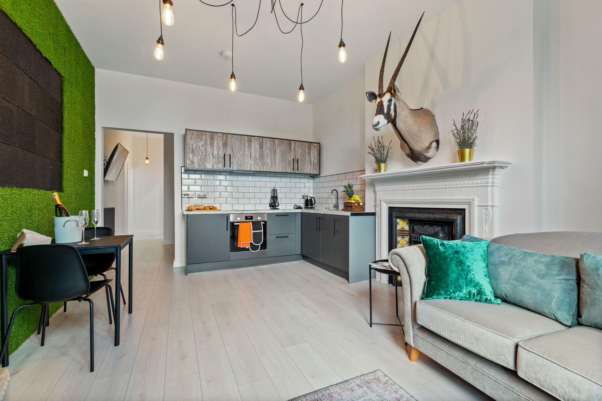 The main living area is adorned with a carefully curated antique taxidermy and a stunning grass wall feature that spans one side of the apartment. The lush and verdant wall brings the outdoors inside, infusing the space with a refreshing and calming ambiance. The kitchen area, though compact, exudes its own charm with modern appliances and ample cabinetry space. The sleeping area is a haven of comfort offering a cosy retreat. A plush bed with elegant bedding invites you to enjoy a rested sleep after a long day exploring. The bathroom is of modern design, featuring sleek fixtures and a walk-in shower with a rainfall showerhead. It’s a tranquil space where you can refresh and rejuvenate after a day of urban exploration. Beyond the enchanting interior, the apartment's location in the heart of the town centre ensures that the vibrant energy of the town is just a step away. With cafes, shops, and cultural hotspots within easy reach. Our town centre studio apartment featuring antique taxidermy is a true masterpiece, celebrating the art of preservation. It’s a haven for those who appreciate the charm and luxury living.